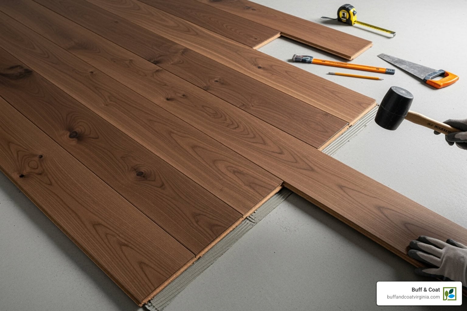 For Richmond area homeowners dreaming of hardwood over concrete, partnering with experienced professionals protects your investment and your sanity. At Buff & Coat, we’ve successfully completed countless solid wood floor on concrete installations using proven techniques and professional-grade materials. Our team knows how to read concrete slabs, control moisture, and execute flawless installations that last for decades.